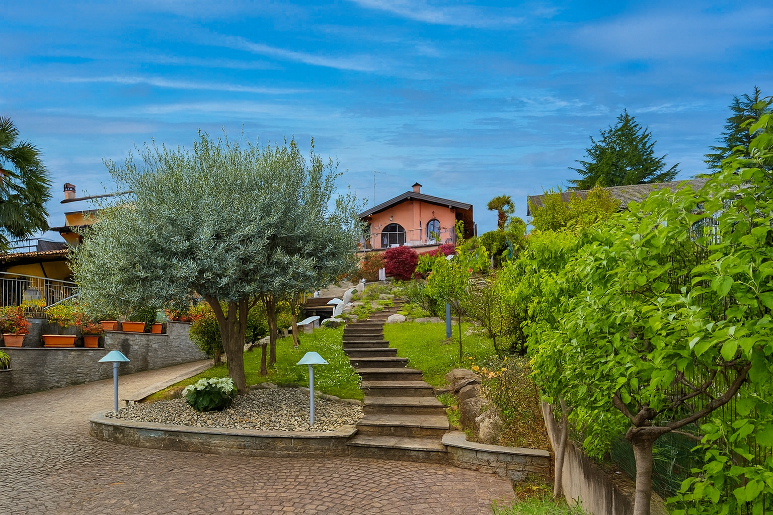 garage doppio con porta rinforzata automatizzata, mentre una scala in granito conduce alla villa e al giardino principale, ideale per momenti di relax ammirando la vista lago.