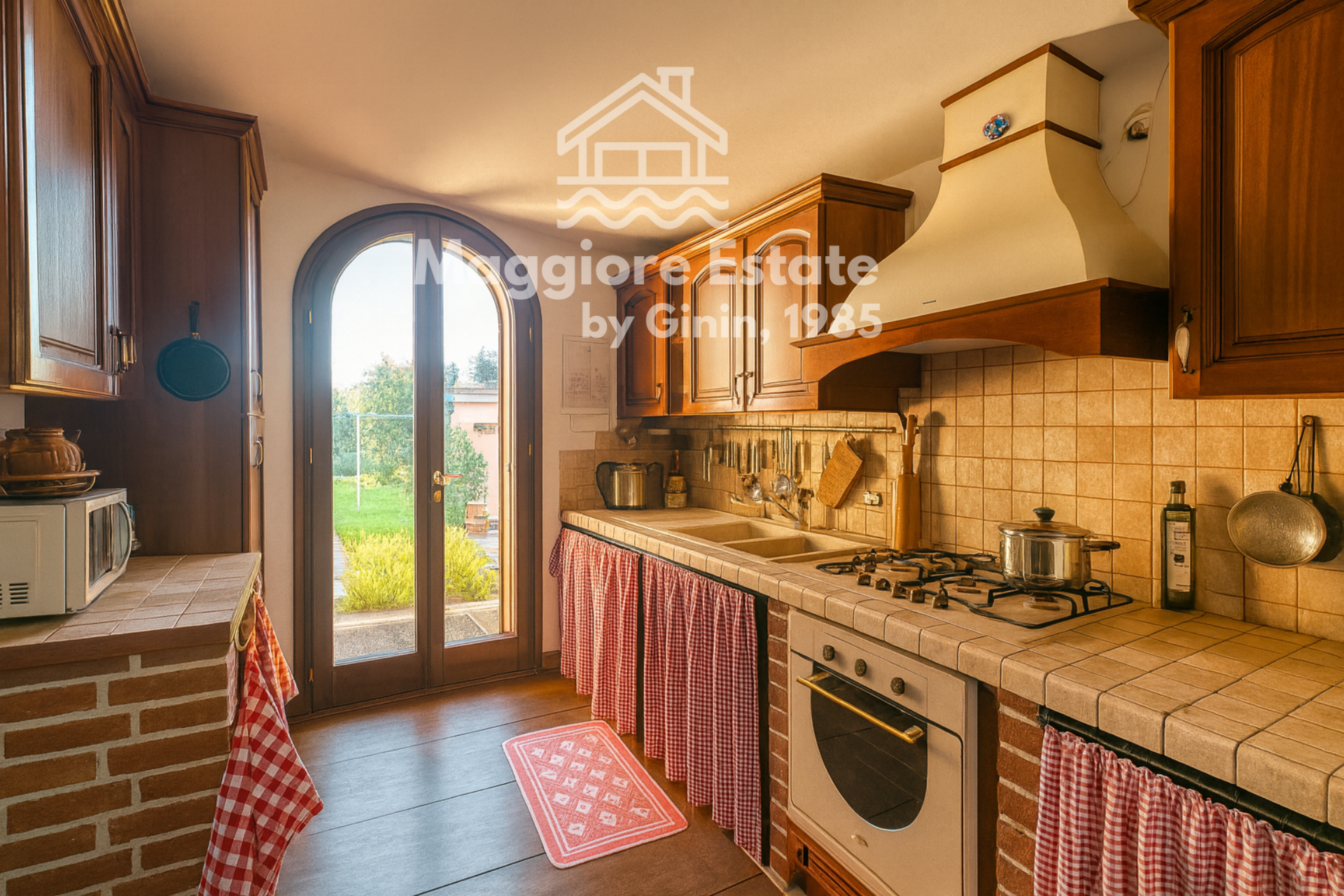 Zona giorno: soggiorno accogliente con camino a ventilazione forzata, cucina in muratura con angolo bar e barbecue esterno. Bagno ospiti incluso.