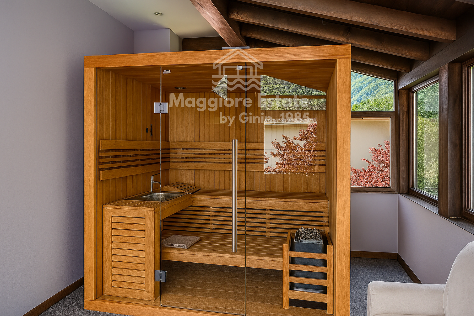 Dal soggiorno si accede a un’area benessere privata, attrezzata come sala fitness con sauna, e a una grande terrazza soleggiata ideale per momenti di relax e pranzi all’aperto.